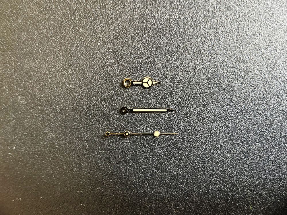 <> One set of thinner golden Mercedes Benz watch hands with dirty luminova glow green light in the darkness for old style 40mm Submariner or 36mm Explorer fit ETA 2836 or 2824 movements